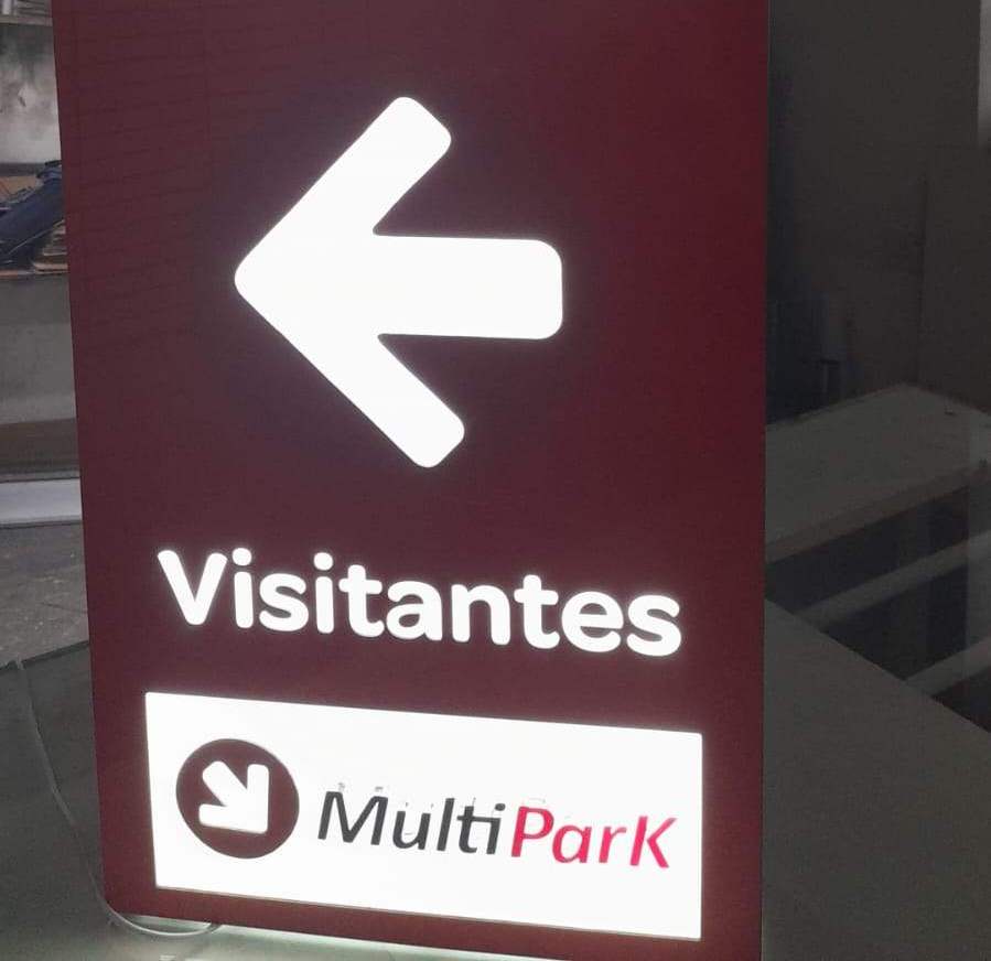 É uma placa em ACM com as letras, logos e todos os elementos vazados, permitindo que a luz ultrapasse e ilumine o luminoso como um todo.